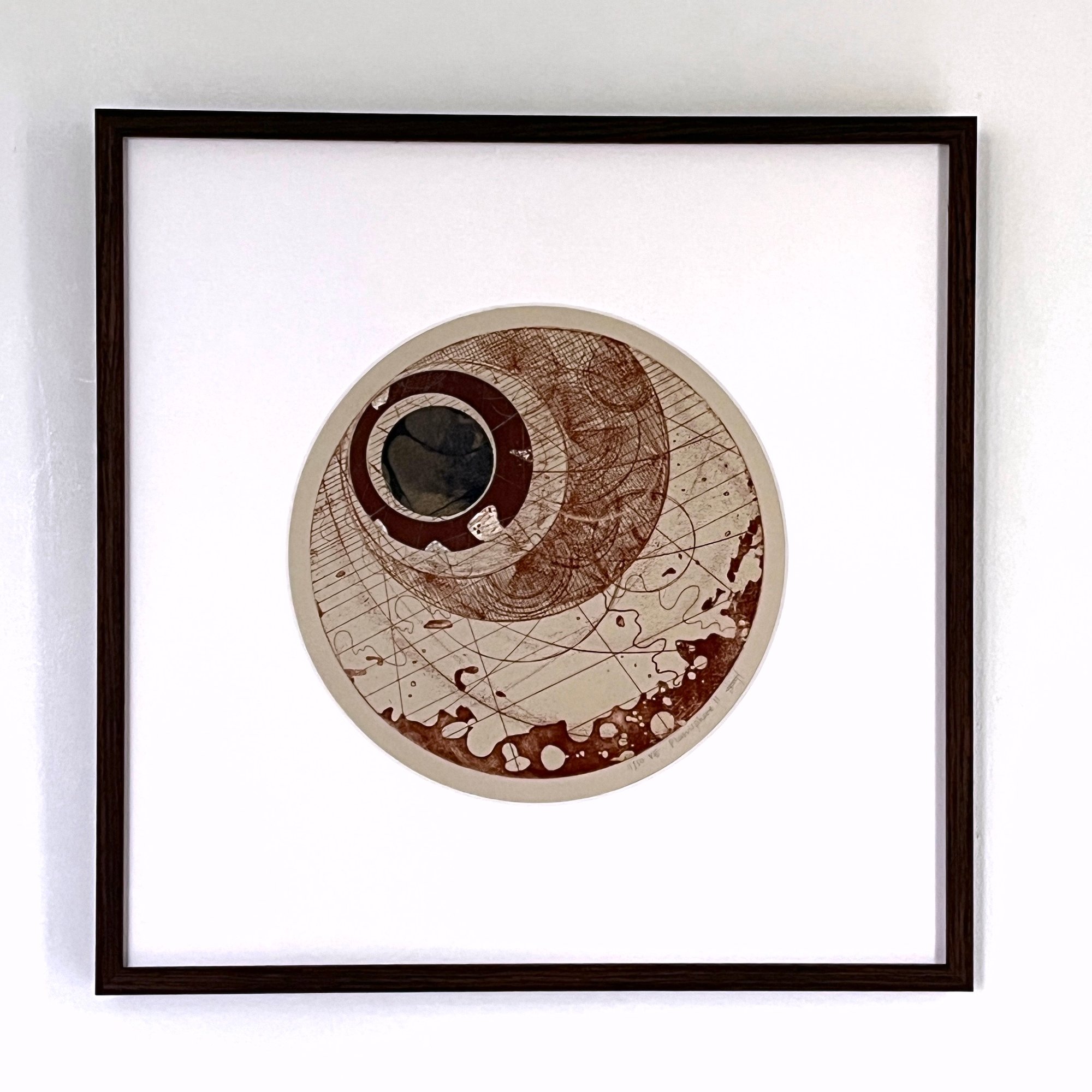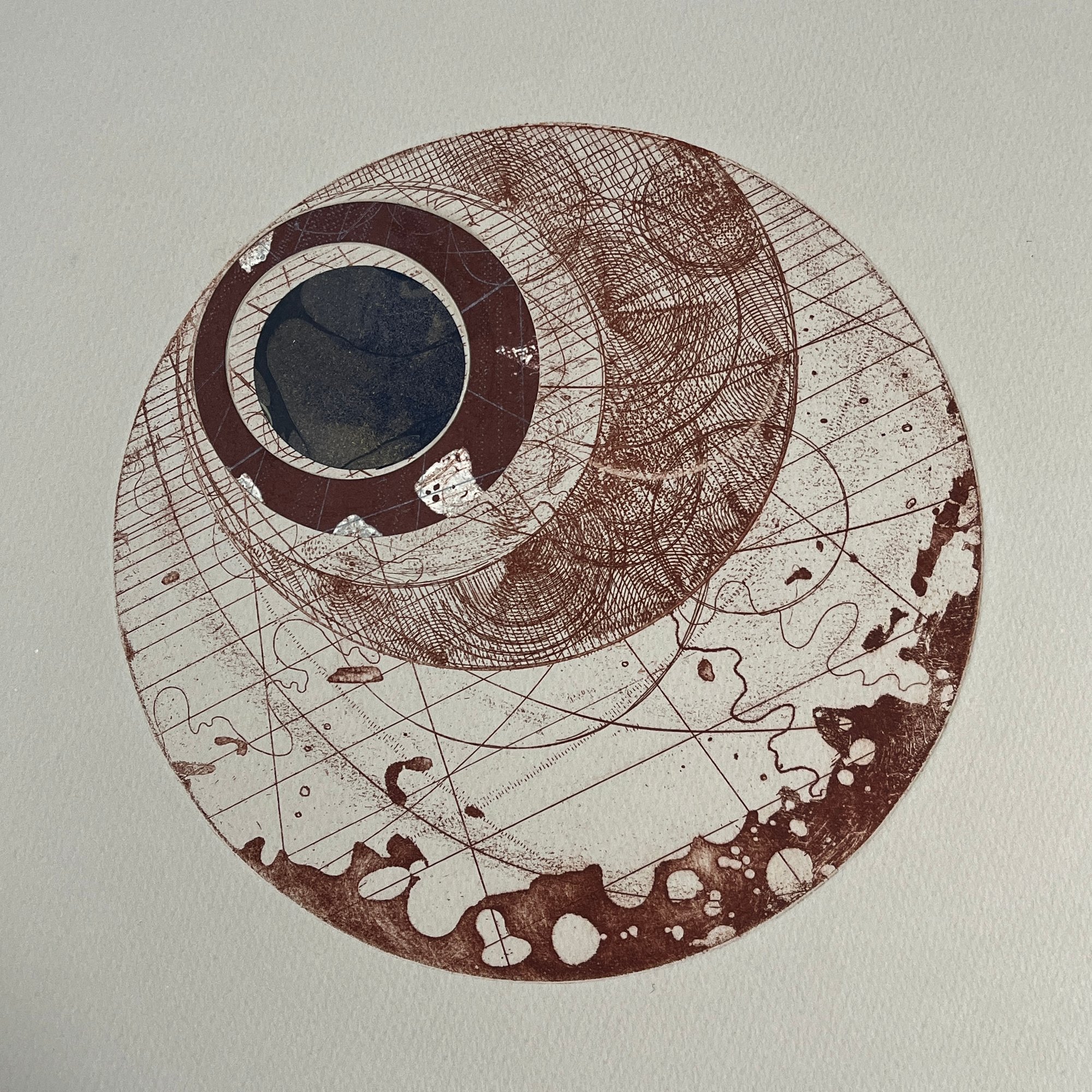 20cm diameter etching print with collaged details